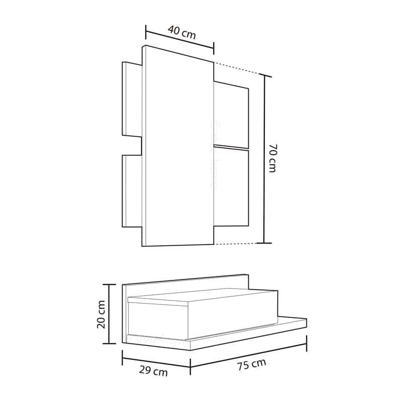 Medidas Móvel: 75cm (largura) x 116cm (altura) x 29cm (profundidade) Fabricado em melamina Cores: Branco e Carvalho, Branco e Cinza Inclui uma gaveta útil e um grande espelho Montagem necessária (inclui instruções)